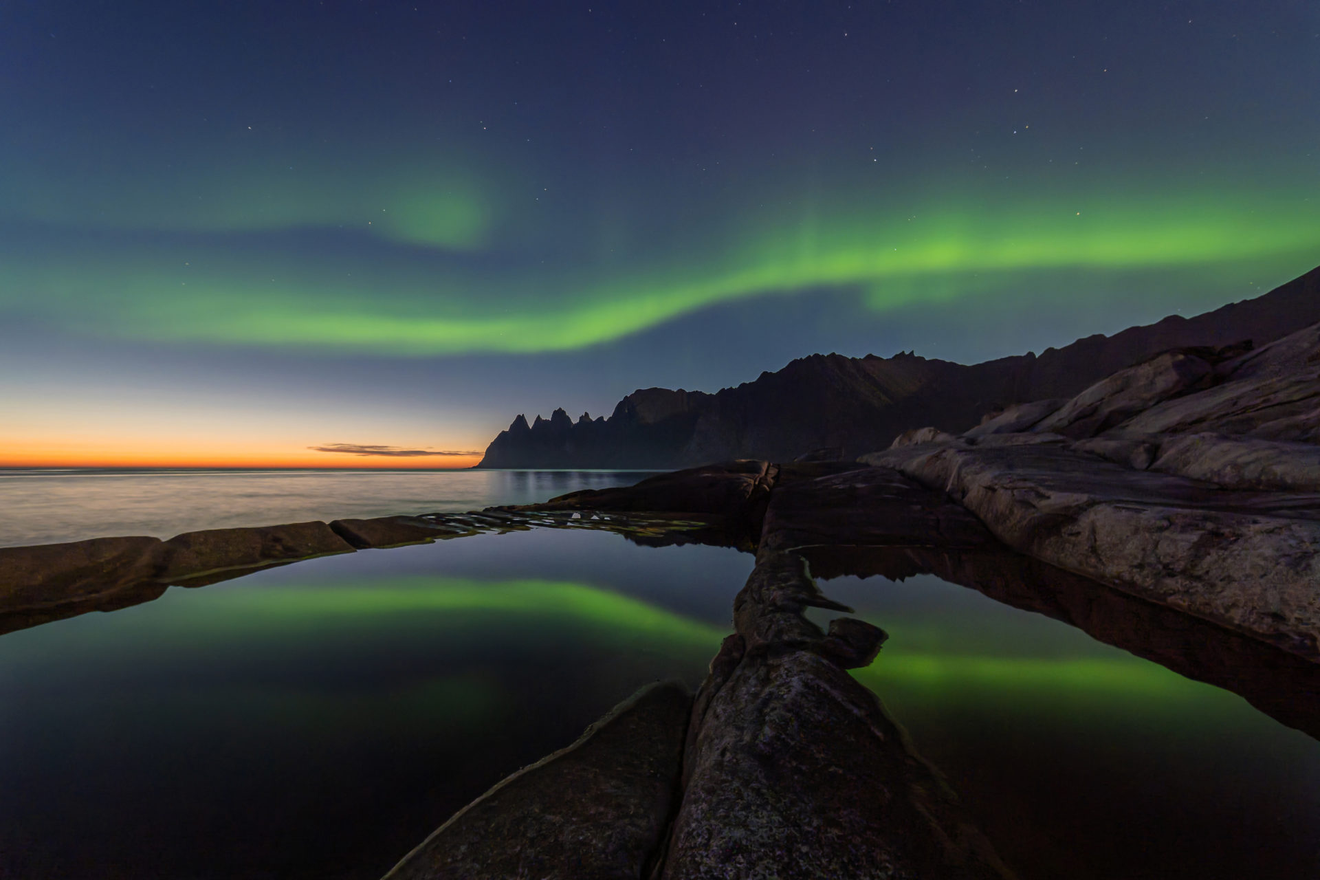 Das lange Warten hat sich gelohnt. Endlich Nordlichter am „Tungeneset“ (Nord-Norwegen/ Insel Senja). Klares Wetter und Windstille waren notwendig, um die Aurora Borealis mit Spiegelung so ablichten zu können. Noch am späten Abend war Anfang September am Horizont eine leichte Dämmerung zu erkennen, was dem Foto zusätzlich Farbe verleiht.