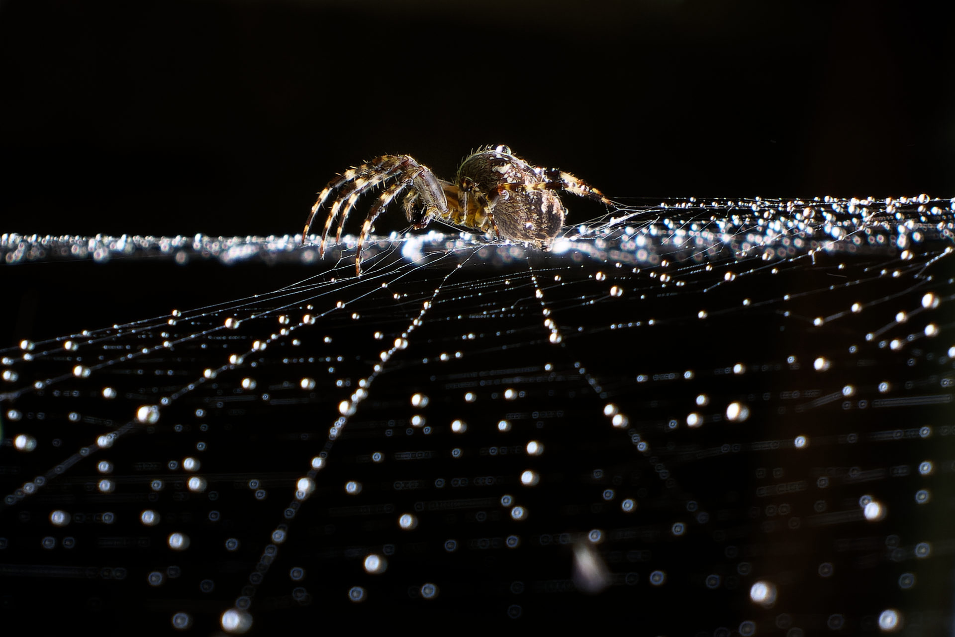 Der eigene Garten kann manchmal die wundervollsten Motive bereitstellen. Zufällig fiel mein Blick auf ein Spinnennetz an der Gartenlaube, übersät mit funkelnden Tautropfen. Um die Kreuzspinne richtig in Szene zu setzen, entschied ich mich für eine Aufnahme parallel zum Netz. So verschwommen die kleinen Tautropfen im Vorder- und Hintergrund zu schönen Lichtreflexen.