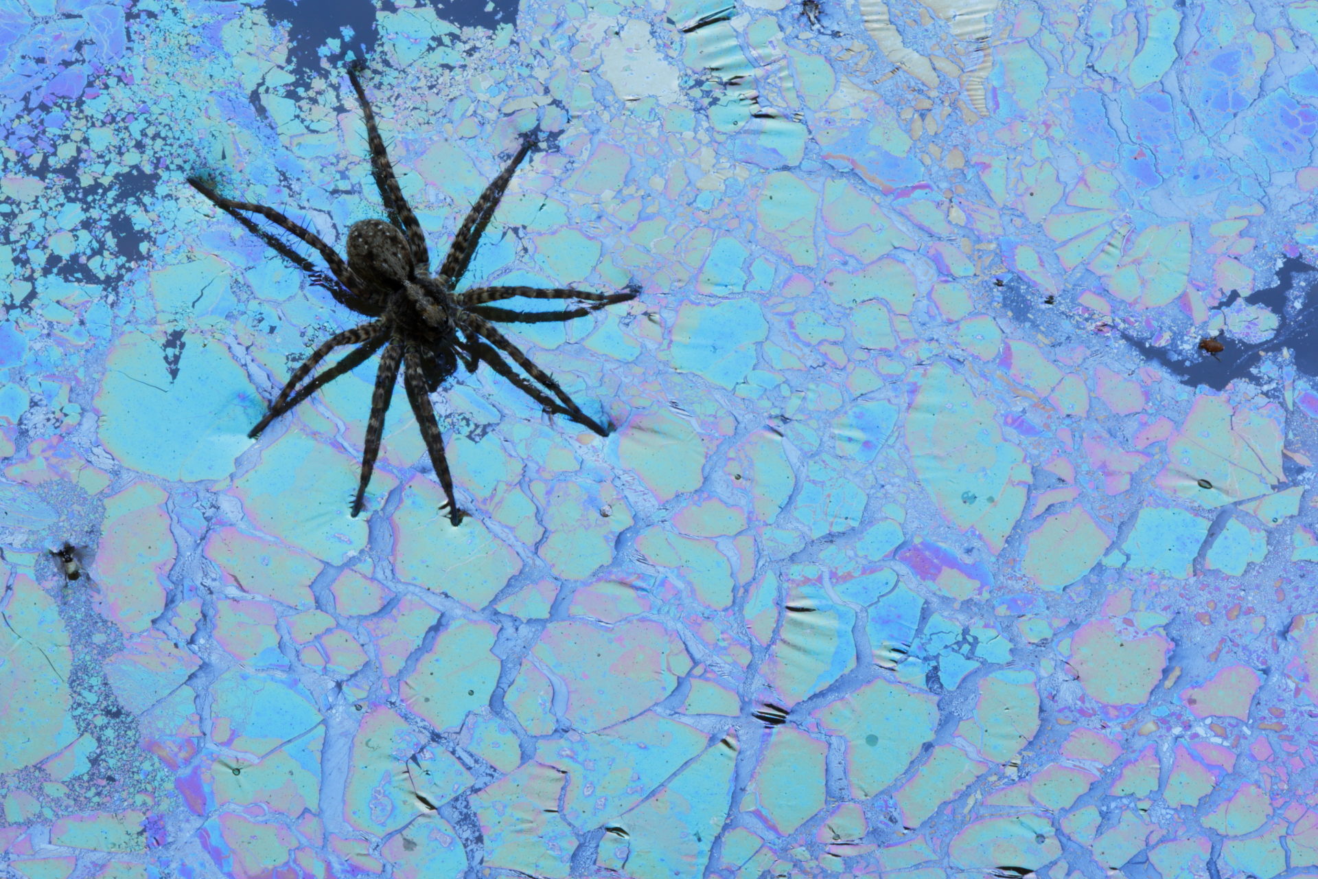 In einem Auwald in der Nähe meines Wohnortes,fand ich eine Wasserstelle mit Farben des Eisenoxids, das sich dort auf natürliche Weise gebildet hat.Eine Spinne hielt sich zum Glück einige Zeit auf der Oberfläche,so das ich mehrere Aufnahmen machen konnte.