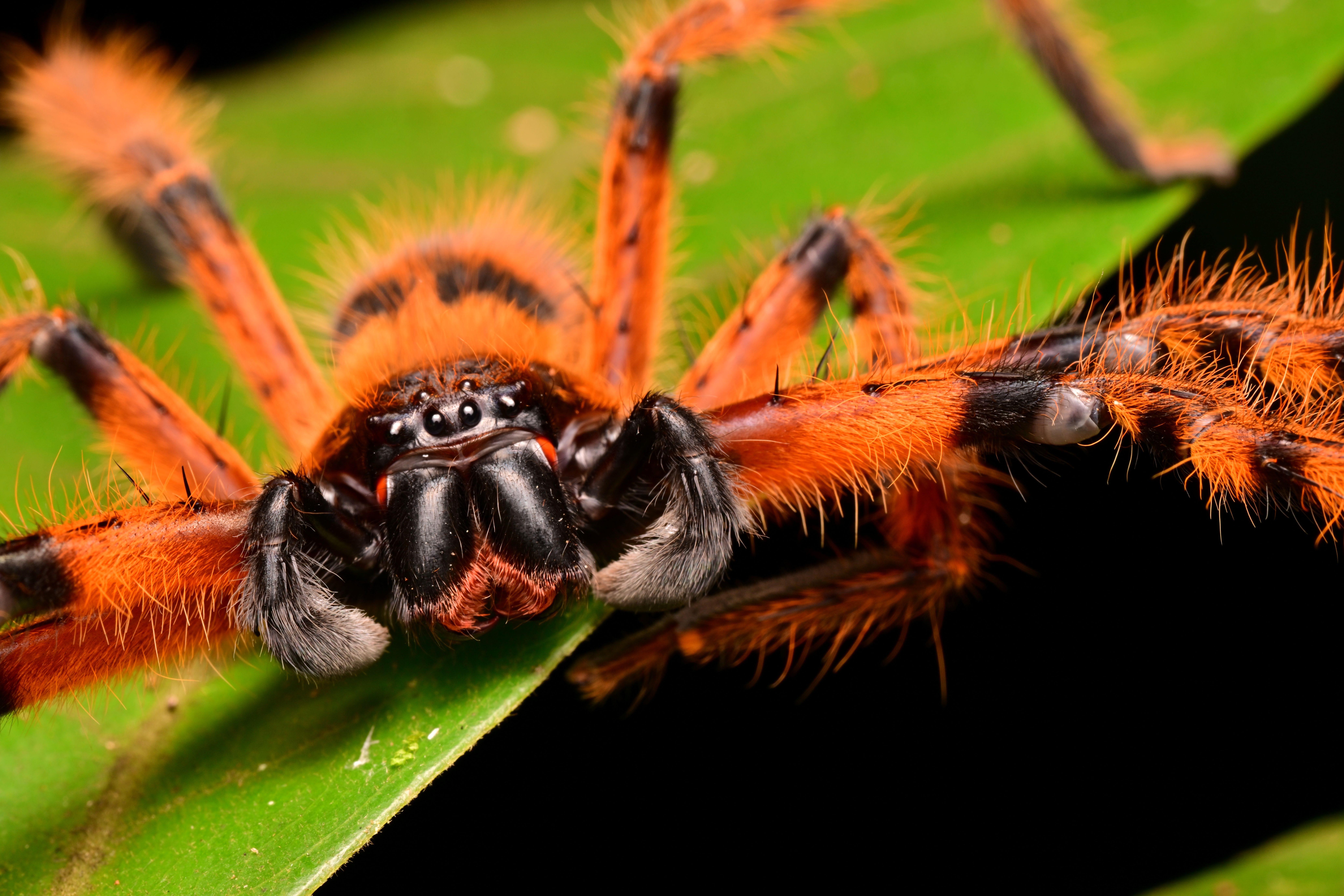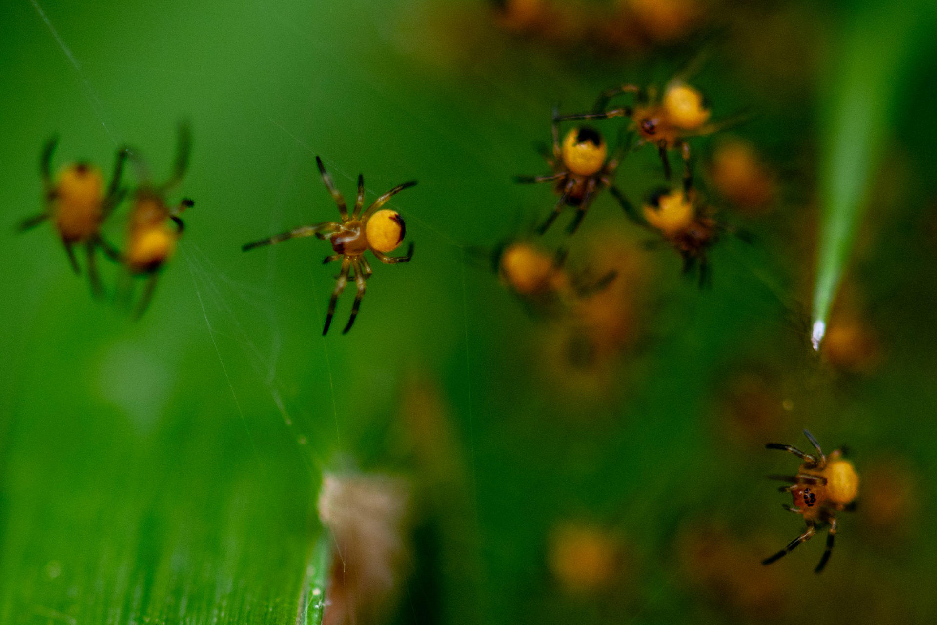 Auf dem leuchtend grünen Blatt Borneos sitzt eine auffällig orange gefärbte Huntsman Spinne (Rhitymna pinangensis) und scheint ihre Umgebung aufmerksam zu beobachten. Ihre langen, kräftigen Beine sind breit ausgestreckt, bereit, sich im nächsten Moment blitzschnell zu bewegen. Die feinen Haare und dunklen Zeichnungen auf ihrem Körper heben sich deutlich vom Hintergrund ab und verleihen ihr ein zugleich faszinierendes und dennoch bedrohliches Aussehen. Sie ist keines Wegs auf Tarnung angewiesen. Als Jägerin verlässt sie sich nicht auf Netze, sondern auf Geschwindigkeit und Präzision. Nikon Z 9, mit Nikkor Z MC 105mm 1:2,8 VR S f/16, 1/125 Sek., ISO 200, Blitz SB-5000 halblast.