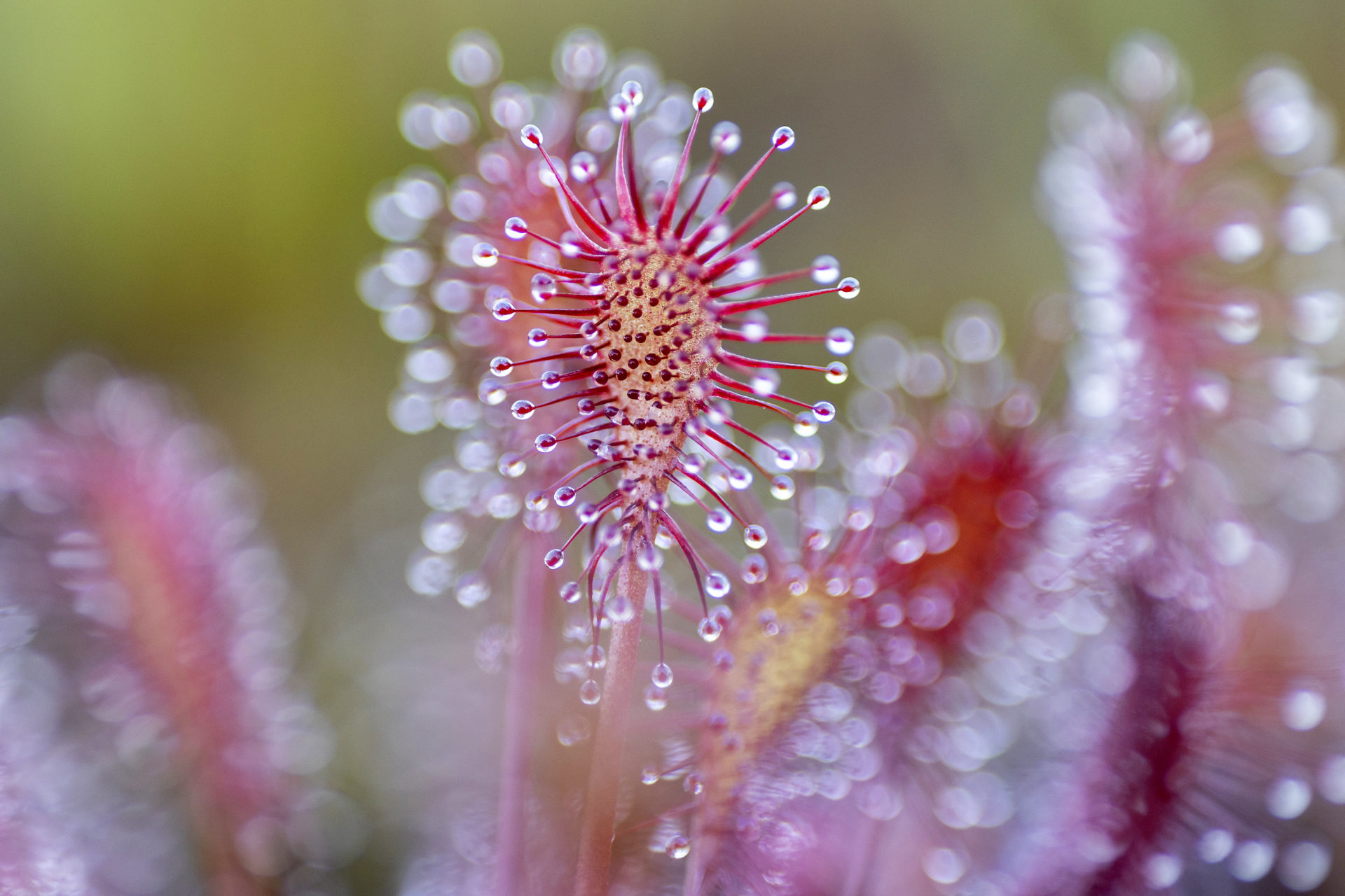 Dieses Bild vom Langblättriger Sonnentau entstand im Neustädter Moor in der Nähe von Diepholz Anfang September. Ein Pfad über Stege führt durch die blühende Heide und bei genauem Hinsehen entdeckt man dann auch den Sonnentau. Durch die bewusste Wahl der Offenblende wollte ich ein einziges Sonnentau hervorheben umrahmt von einem Glitzern der anderen unscharfen Sonnentaus.