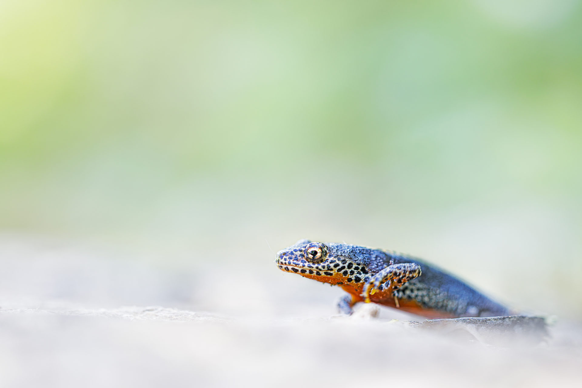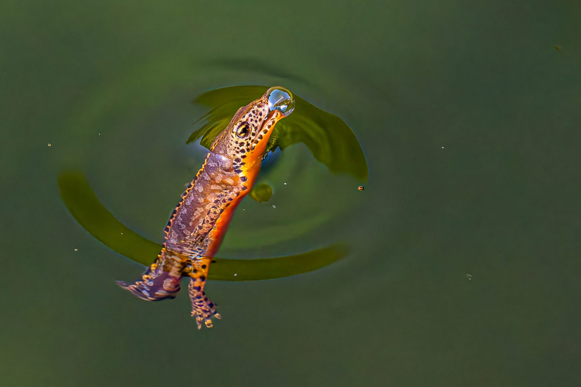 Der Bergmolch taucht regelmäßig an die Oberfläche, um Luft zu schnappen. Im hauseigenen Teich lässt er sich mit viel Geduld beobachten.Unvermittelt erscheint der farbenprächtige,männliche Molch, durchbricht die Wasseroberfläche, holt in Sekundenbruchteilen Luft und taucht sofort wieder in die Tiefe. Für die Fotografie ist es genau dieser Augenblick, der Konzentration,Ausdauer und Glück verlangt.