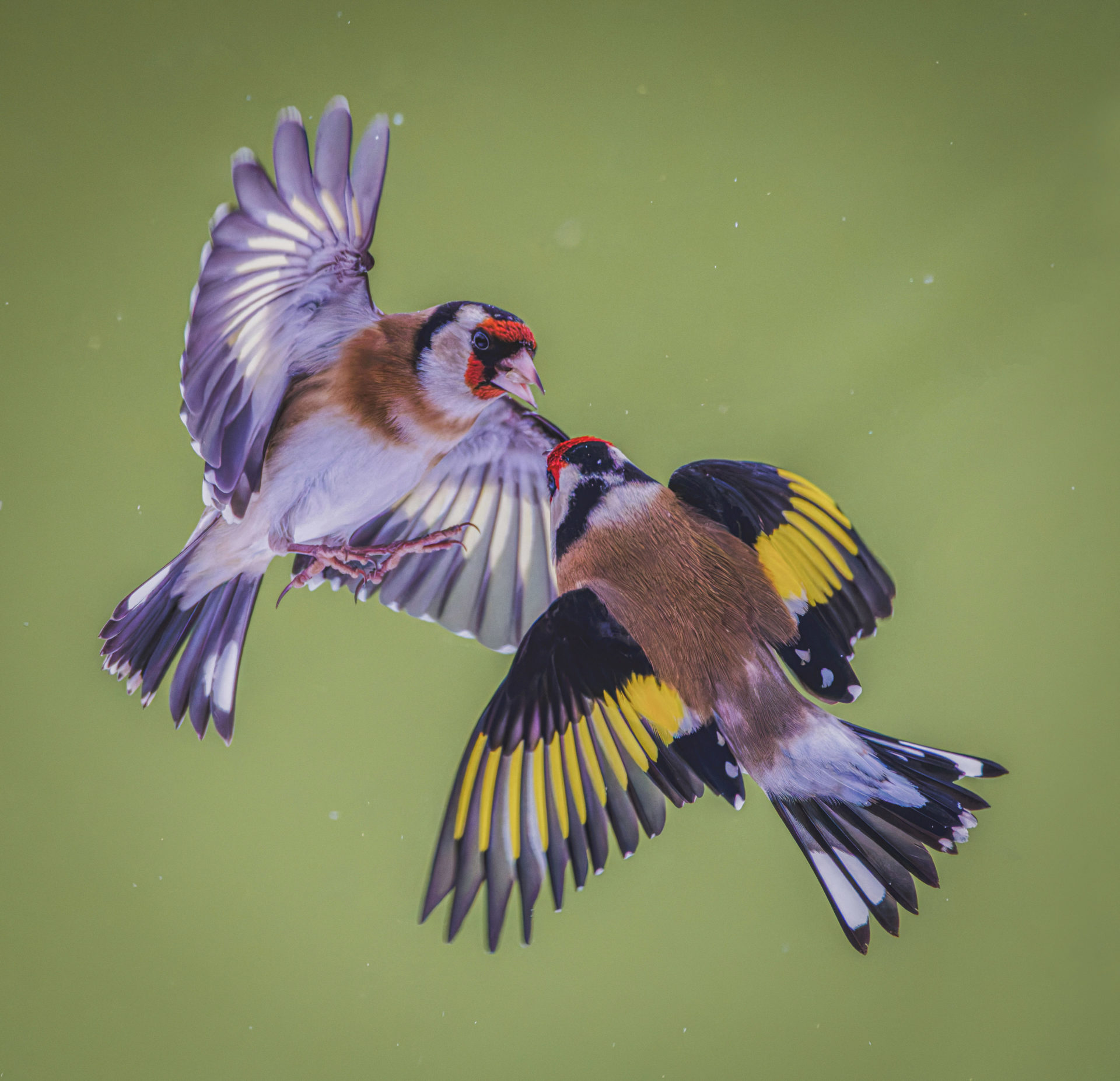 In meinem Garten haben wir in diesem Winter ca. 15 Stieglitz, die immer wieder um Futter streiten. Gut einzufangen sind diese Vögel direkt neben der Futtersäule. Die Kamera auf Dauerfeuer gestellt, erwischt man sie im Streit um das Korn. Vom Wohnzimmer aus relativ einfach zu fotografieren.