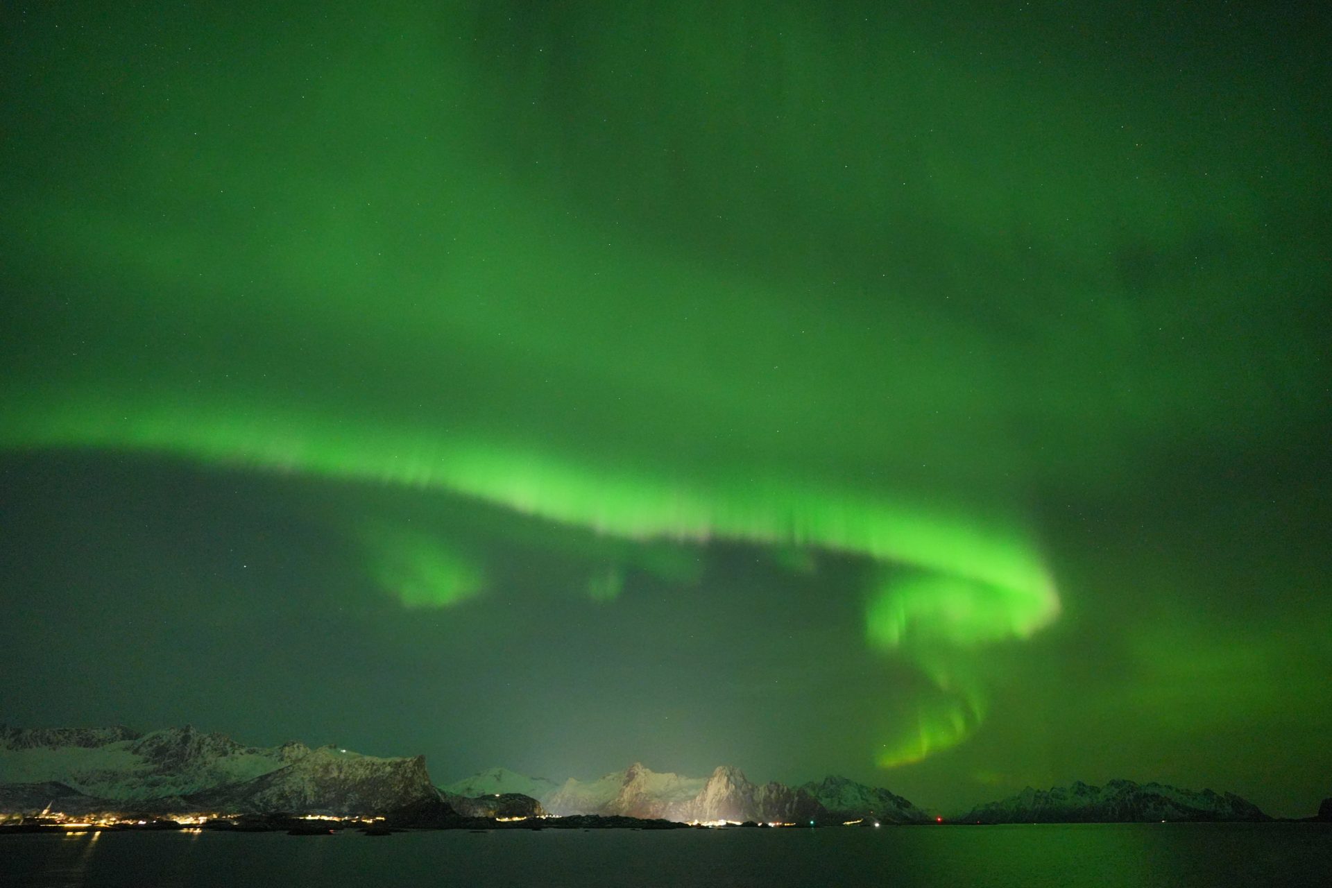 Nordlichten sind typische Nachterscheinungen in hohen Norden. Philippe A. Doisy aus Guttet-Feschel (Schweiz) könnte diese Himmelsphänomen in die Lofoten fotografieren. Wir waren in Februar 2025, die Sonne war sehr aktiv, die Nächte lang genug und dazu war der Himmel wolkenfrei. Bei diese drei Bedingungen um Nordlichten beobachten zu können müsste ich nur noch ausharren in die polare Kälte. Dazu wollte ich eine schöne Landschaft als ersten Plan in die Bildkomposition integrieren. Die Berge und die einsamen Siedlungen waren dazu geeignet.