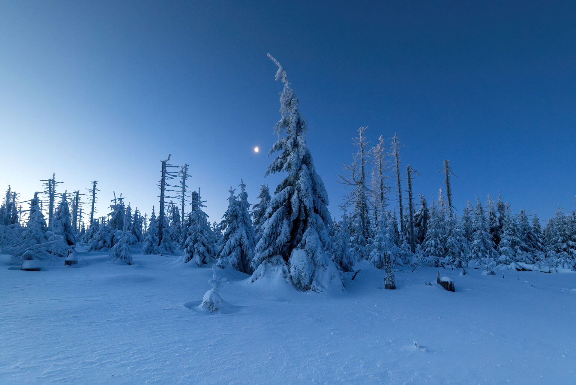 Nachtwanderung zum Sonnenaufgang auf die Achtermannshöhe im Nationalpark Harz. Ich war beeindruckt von der Stille im Wald, fasziniert von den schneebedeckten Bäumen. Nur das fahle Licht des Mondes spiegelte sich auf der weißen Landschaft. Glücklich konnte ich diesen magischen Moment fotografisch festhalten.