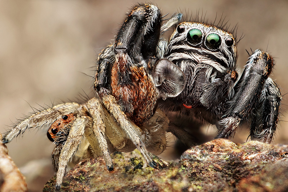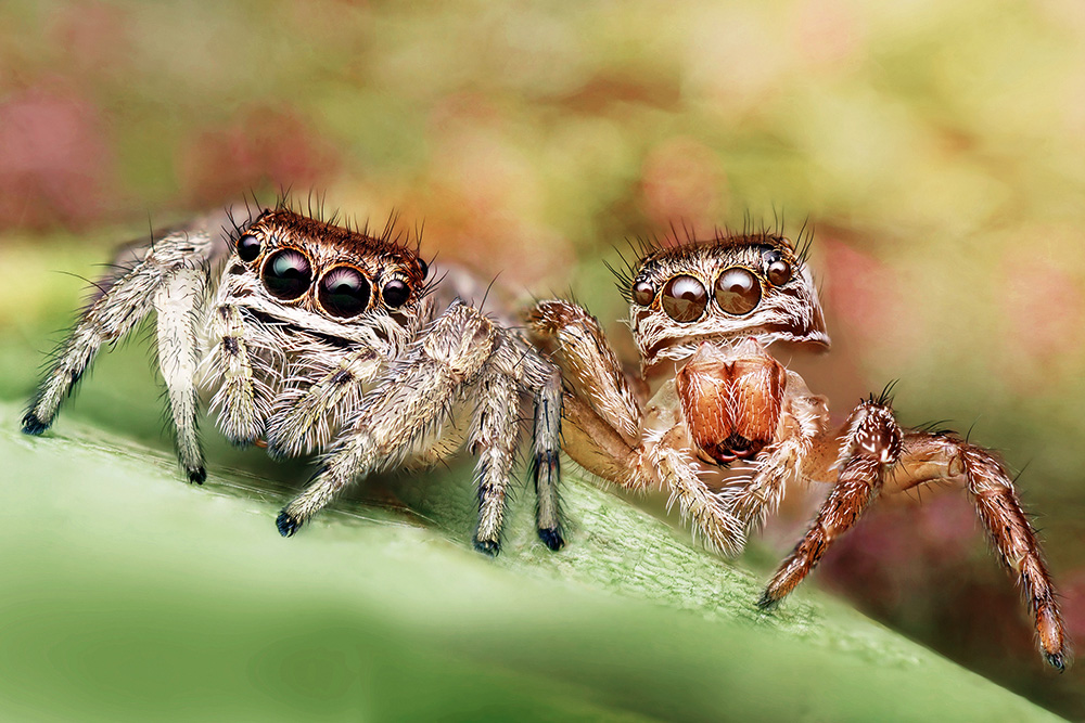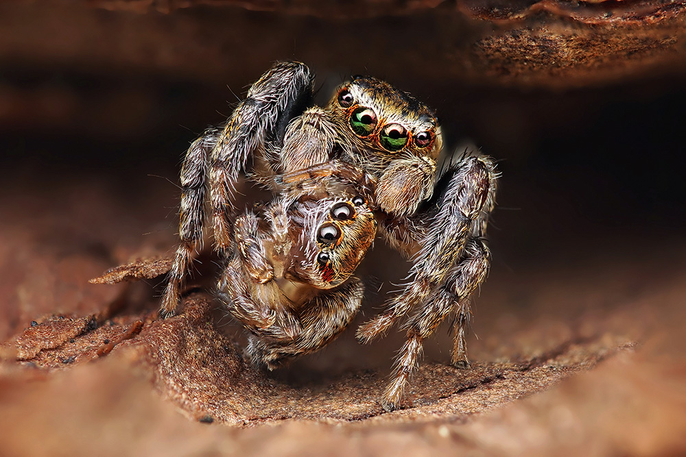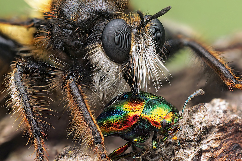 Speziell für Spinnen habe ich mich schon seit meiner Kindheit begeistern können. Damals waren es aber eher die großen Arten wie Winkelspinnen und Kreuzspinnen, die ich rund ums Haus fand, die mich faszinierten, gleichzeitig aber auch etwas gruselten. Seit ich die extreme Wildlife-Makrofotografie ausübe, sind es aber besonders sehr kleine Spinnenarten, allen voran die Springspinnen, die mich interessieren. Springspinnen scheinen wie gemacht für die extreme Makrofotografie. Nur durch wirklich hohe Abbildungsmaßstäbe wird die Schönheit dieser fantastischen Winzlinge überhaupt erst richtig erkennbar. Neben Springspinnen fotografiere ich besonders gerne Raubfliegen, auch sie sind sehr interessant und überaus fotogen.