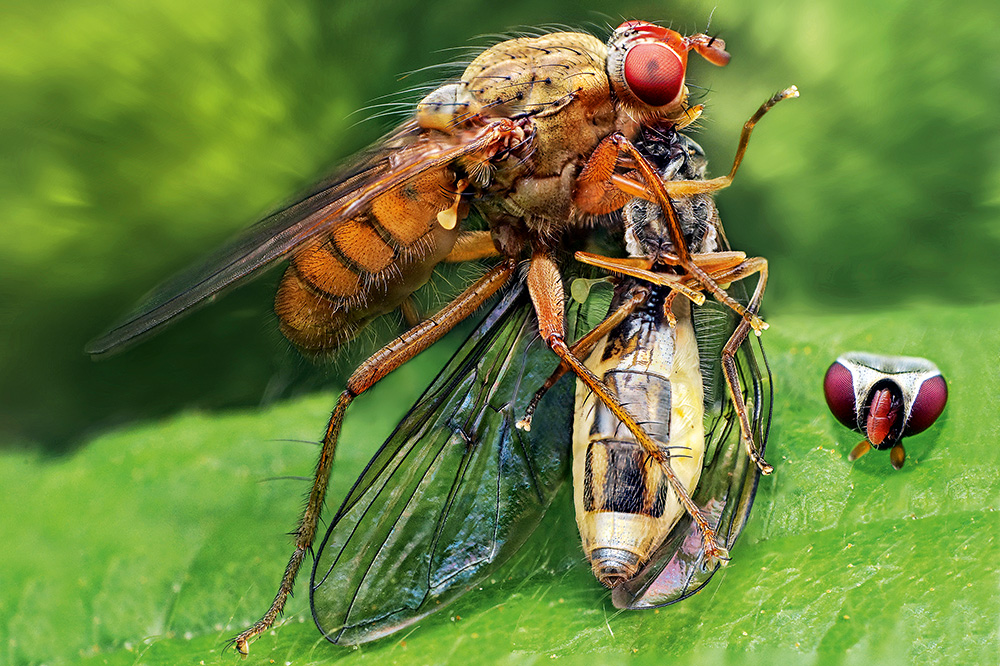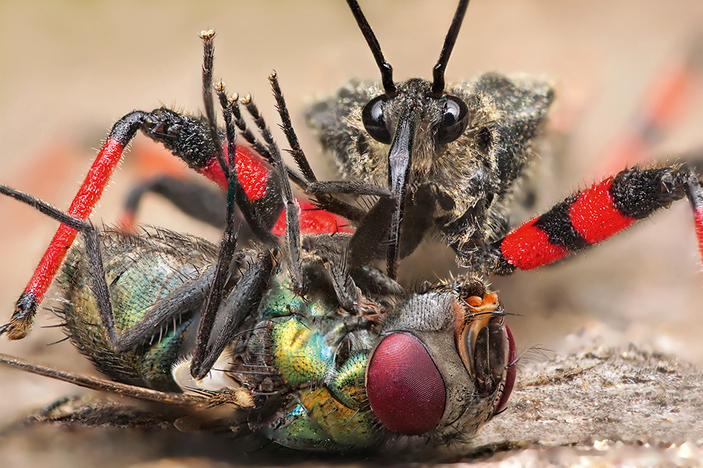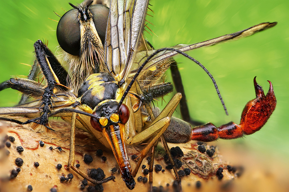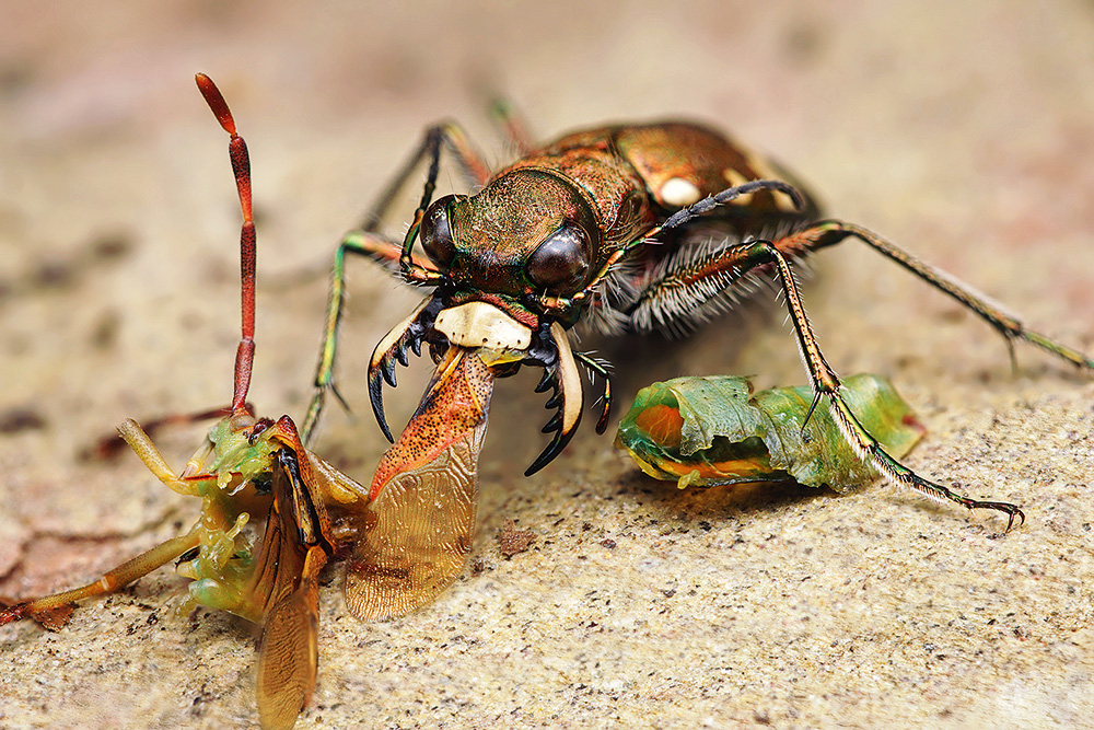 Wer auch hierzulande exotisch anmutende Motive sucht, wird schnell fündig, wenn er sich mit Makro- oder Lupenobjektiven auf die Suche nach Insekten oder Spinnen begibt. Alexander Mett ist geradezu besessen von den kleinen Krabbeltieren, und er hat sich in den letzten Jahren Methoden angeeignet, um die sechs- und achtbeinigen, oft nur wenige Millimeter großen Geschöpfe in Aktion abzulichten und dabei gleichzeitig die für große Schärfentiefe im extremen Nahbereich nahezu unverzichtbare Focus Stacking-Technik anzuwenden. »Extreme Wildlife-Makrofotografie« nennt er selbst das, was er da macht, und er legt großen Wert darauf festzustellen, dass seine Modelle weder betäubt noch sonstwie manipuliert werden und auch nach der Fotosession noch quicklebendig sind.